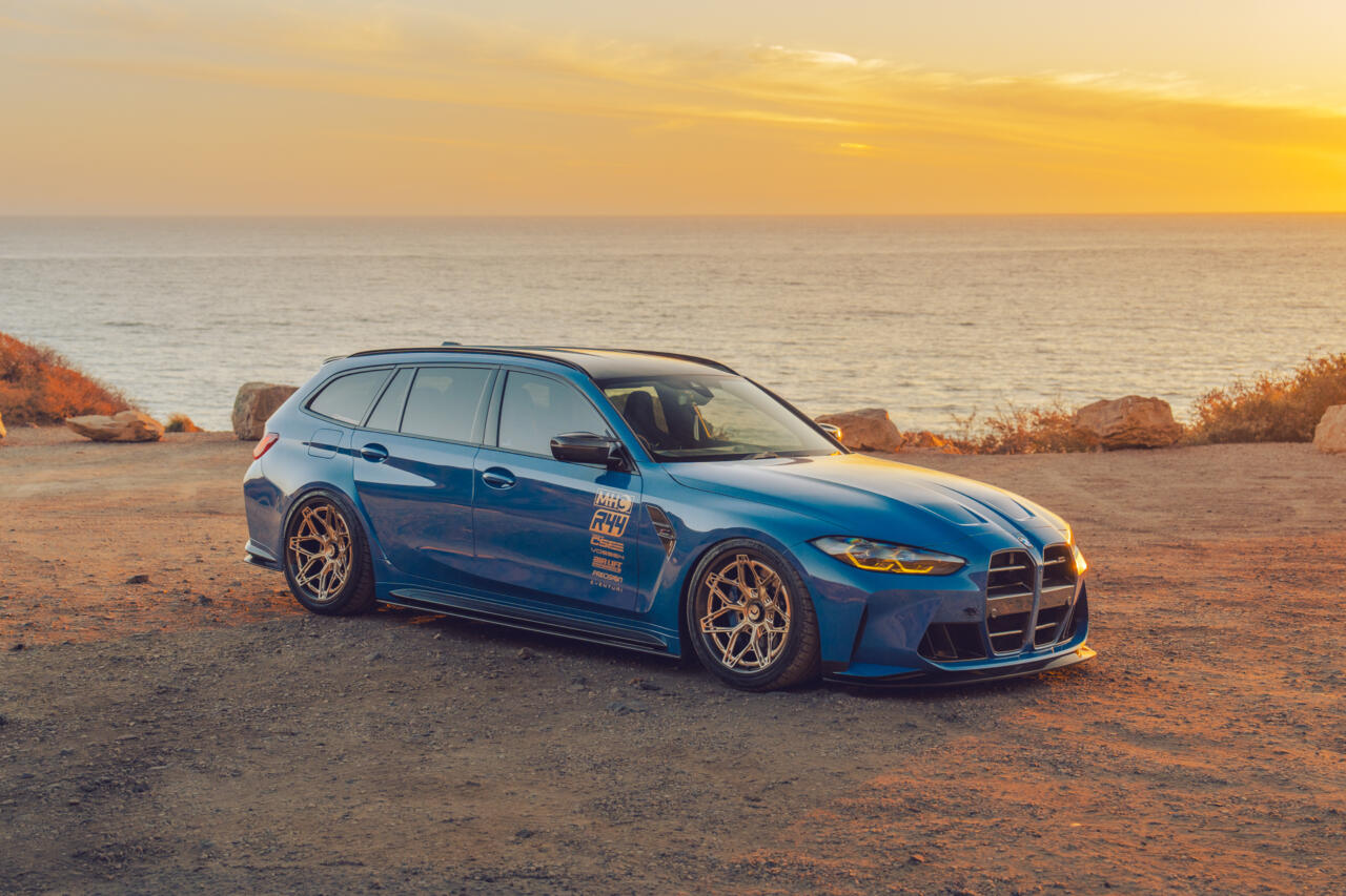 Dal punto di vista estetico, l’auto presenta una verniciatura “Super Gloss Narwhal Blue”, un tetto in fibra di carbonio, condotti dell’aria aftermarket, un kit carrozzeria davvero di classe e un set di cerchioni in carbonio Vossen S21-08 color oro. Grazie ad un sistema di sospensioni pneumatiche, l’auto presenta una posizione molto bassa ed estremamente aggressiva. Il tetto in fibra di carbonio è stato sviluppato internamente da R44 appositamente per la M3 Touring.