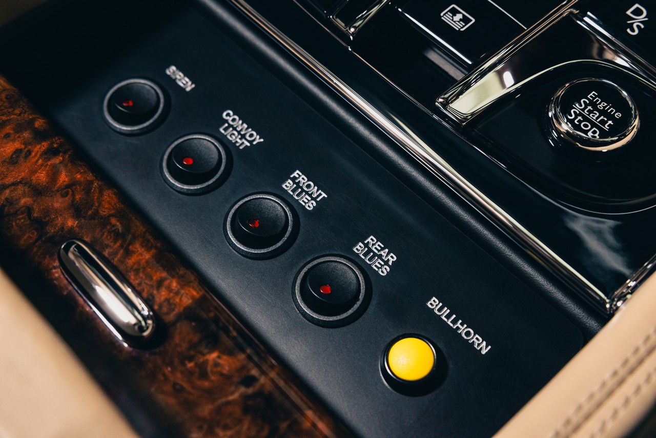 Luci lampeggianti blu, sirena e altoparlante sono discretamente nascosti, con un pannello di interruttori dedicato, dietro una porta rivestita in noce, vicino alla leva del cambio.