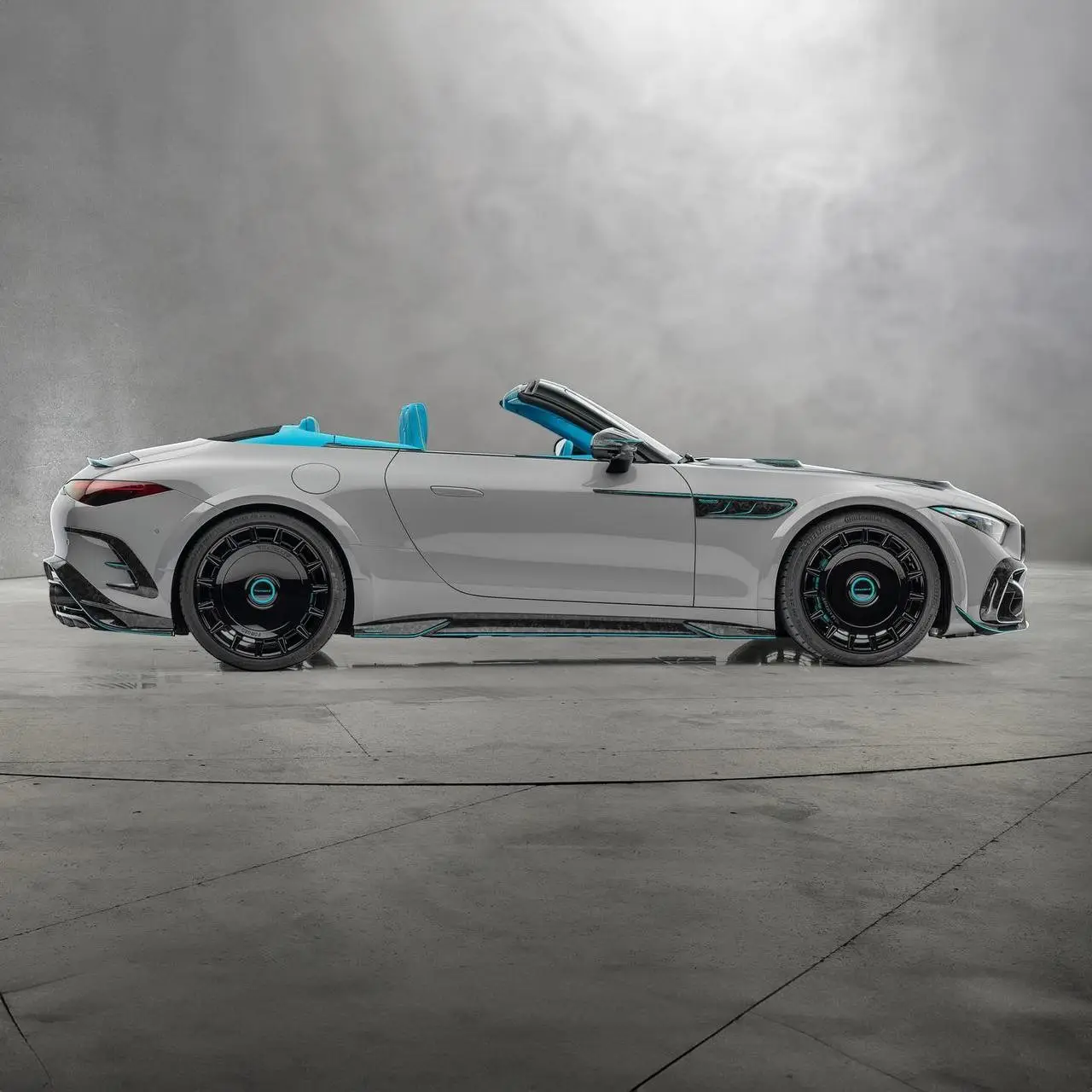 Sul fronte estetico, questa versione della Mercedes-AMG SL 63 si fa notare per il suo frontale caratteristico con una griglia rinnovata, un badge Mansory evidente, elementi in fibra di carbonio e inserti blu. Le luci diurne a LED a forma di L nelle prese d’aria aggiungono un elemento contemporaneo. Mansory ha anche installato minigonne laterali uniche e cerchi aftermarket.