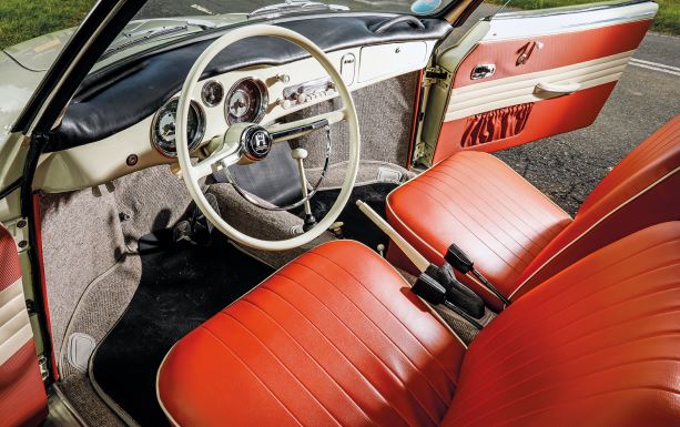 La maggior parte dell’auto è rifinita in Pearl White, che assomiglia più a un color crema spento o un kaki estremamente chiaro, il tutto sormontato da un tetto nero. A completare il pacchetto “grande eleganza” ci sono gli interni rosso mattone e avorio, che, combinati con la moquette a trame spesse, danno un’aria decisamente chic per un’auto che all’epoca risultava relativamente economica.