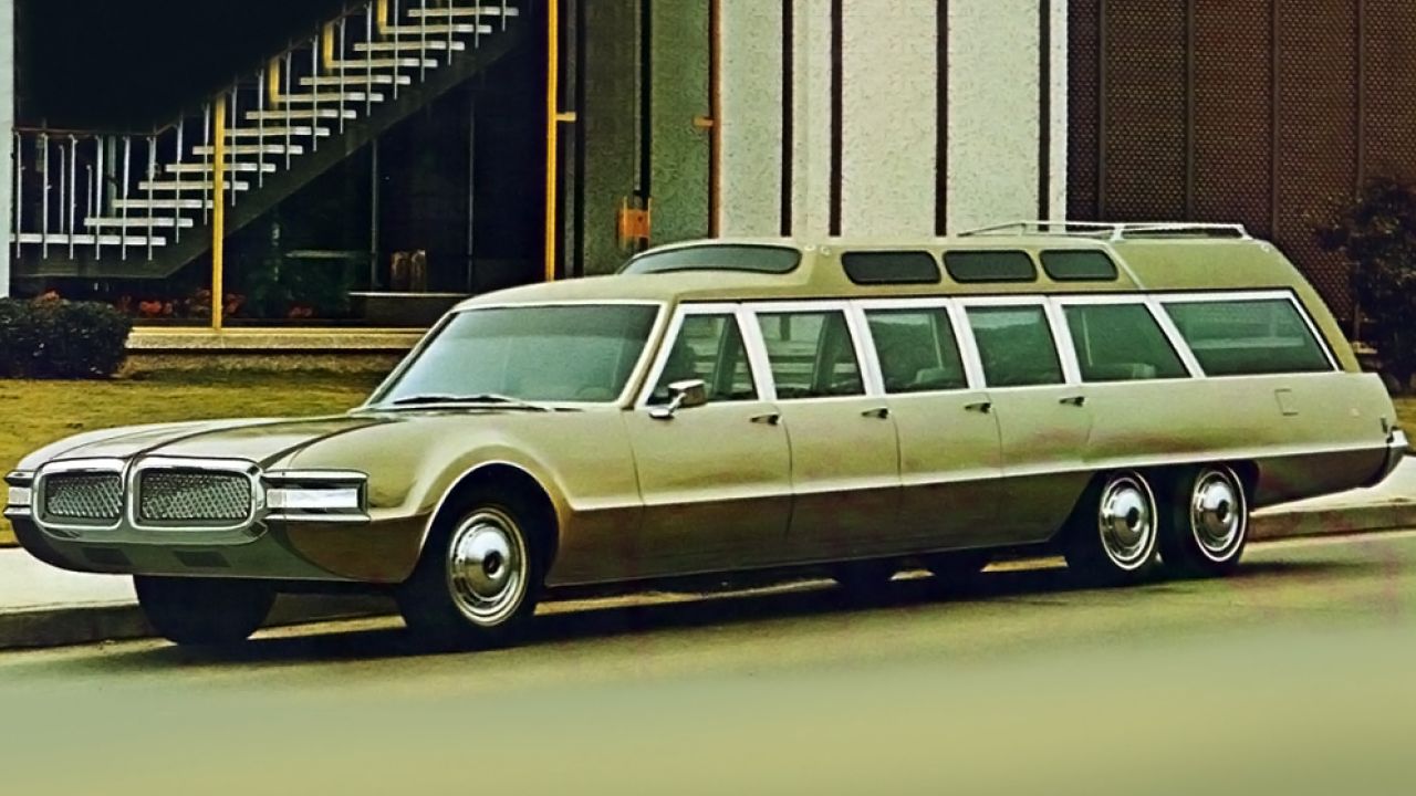 La American Quality Coach Jetway 707 del 1968 (in copertina). Ecco qui una “limousine aeroportuale”, ovvero una station wagon allungata a una lunghezza impressionante. Si tratta di una Olds Toronado stirata e di molto. L’auto era a trazione anteriore, aveva diverse e nuove porte anteriori, un nuovo tetto panoramico, una nuova carrozzeria station wagon con portellone posteriore e più vetri laterali. Ovviamente aggiungeva anche un nuovo sistema di sospensione e frenata per il nuovo terzo asse. Tutto per un risultato (per fortuna) unico.