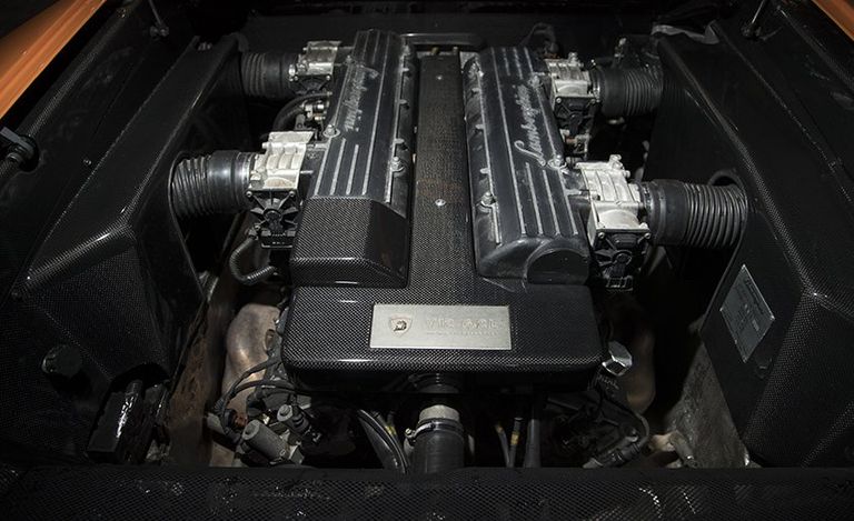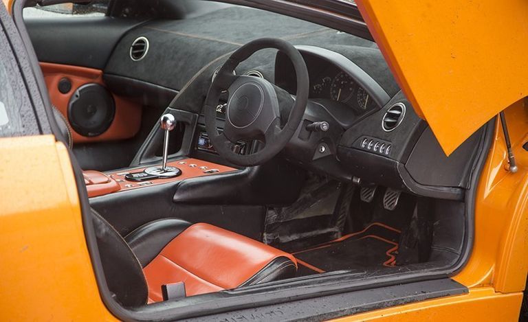 Avvicinarsi a quest’auto rivela segni di cicatrici e interventi chirurgici qua e là, ed è come fare un viaggio nel passato e in tante avventure, ogni volta. Il badge “V12 6.2L” che si trova sul fianco posteriore porta ancora i graffi che ha rimediato nell’incidente. Sotto la sua nuova mano di vernice Arancio Atlas, il tetto contiene tantissimo stucco. La scritta MURCIÉLAGO impressa nella protezione della soglia in plastica è stata consumata e alcuni pezzi di rivestimento interno sono ormai quasi scomparsi. Il simbolo sul pulsante di rilascio del bocchettone di rifornimento è consumato dalle centinaia in cui è stato premuto.