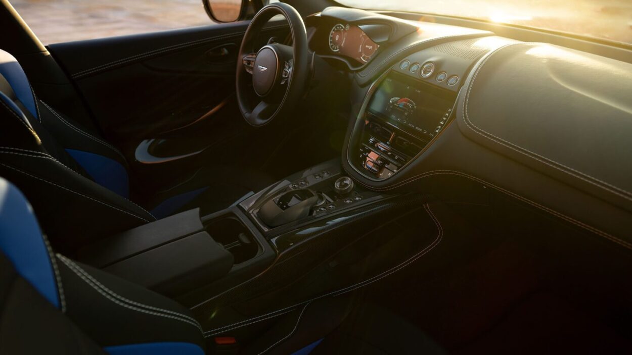 L’interno lussuoso non rinuncia alla spinta sportiva. I sedili escono di serie con regolazioni elettriche a 16 vie, riscaldamento sia sui sedili anteriori che posteriori. Inoltre, sono disponibili tre opzioni per il rivestimento interno. Per questo è anche possibile contattare anche “Q by Aston Martin”, il reparto su misura creato per offrire il top della personalizzazione.