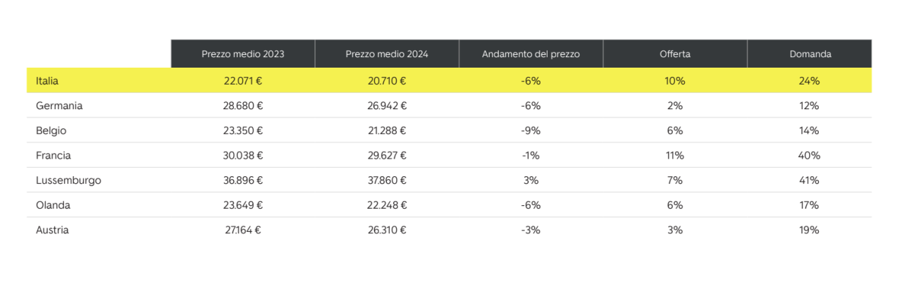 Sale del 17% la domanda di auto usate in Europa nel 2024 sul 2023, con punte che arrivano al +69% per le ibride e del +37% per le elettriche. Scendono i prezzi (-6%, raggiungendo una media di 24.592 euro), con il calo più significativo per le full electric: -17%. Lo dice il report di AutoScout24. I prezzi medi più alti riguardano le vetture ibride (36.863 euro) e le elettriche (31.141 euro). Tra i modelli, la Tesla Model 3 si conferma la macchina a batteria più popolare, seguita da Tesla Model Y e Renault Zoe. In generale, incluse le termiche, Volkswagen domina, seguita da Mercedes-Benz e BMW.