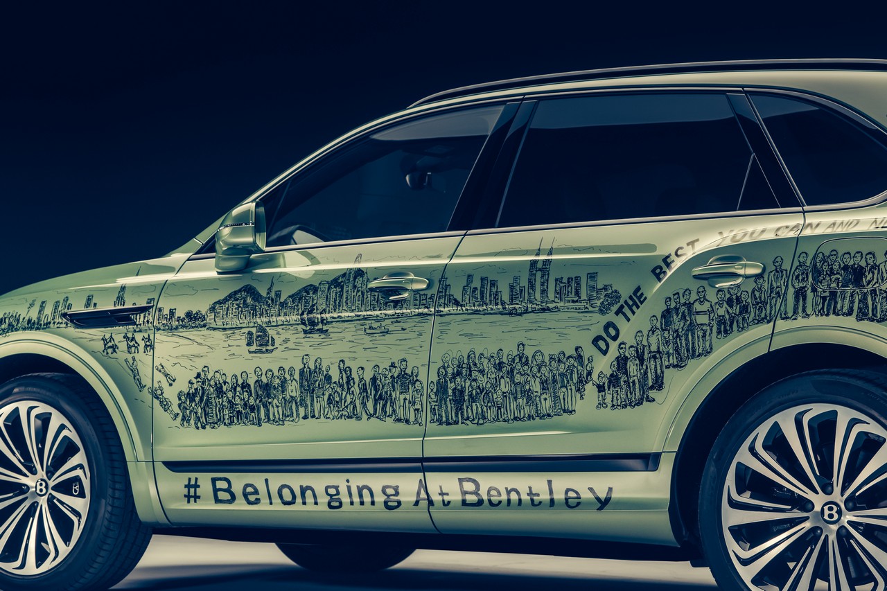 Questa Bentley Bentayga è stata dipinta a mano nello stabilimento di Crewe, dal già citato Stephen Wiltshire, pittore autistico dalla straordinaria memoria fotografica, che gli consente di disegnare un paesaggio dopo averlo visto una sola volta. Il dipinto ha preso forma sulla carrozzeria dell’auto con un processo unico sviluppato dal team Bespoke Paint del Bentley Excellence Center. Oltre agli edifici, nell’opera vengono rappresentate diverse persone di varia nazionalità unite in un unico disegno, come in un abbraccio fraterno e senza barriere.