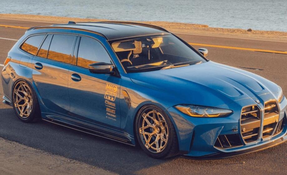 Dal punto di vista estetico, l’auto presenta una verniciatura “Super Gloss Narwhal Blue”, un tetto in fibra di carbonio, condotti dell’aria aftermarket, un kit carrozzeria davvero di classe e un set di cerchioni in carbonio Vossen S21-08 color oro. Grazie ad un sistema di sospensioni pneumatiche, l’auto presenta una posizione molto bassa ed estremamente aggressiva. Il tetto in fibra di carbonio è stato sviluppato internamente da R44 appositamente per la M3 Touring.