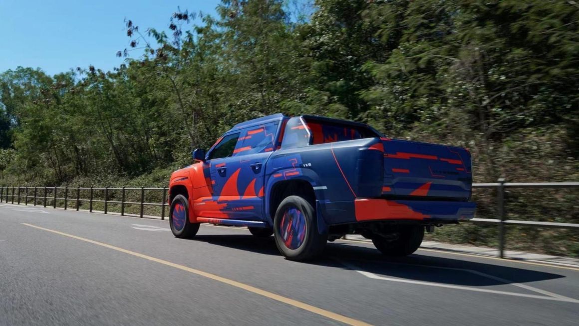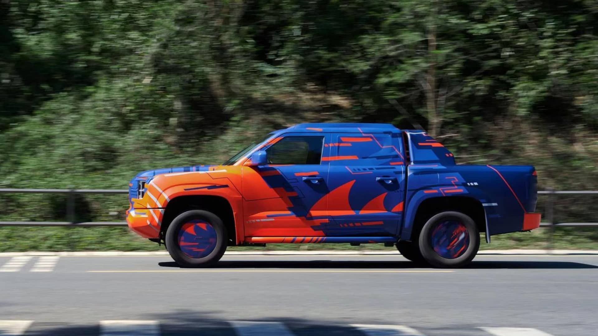 Nelle immagini pubblicate dalla casa automobilistica cinese, il pickup è coperto da un camouflage blu e arancione. Tuttavia, è possibile vedere i fari a due lenti che ricordano la forma di un “8”, ampi passaruota, una linea del cofano alta e gli specchietti retrovisori laterali molto grandi. Il modello presenta anche un cassone corto e delle barre sul tetto.