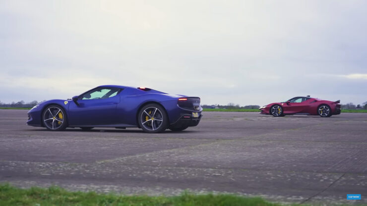 A favore della più piccola della coppia gioca il peso, nettamente più basso: 1470 chilogrammi contro 1670 chilogrammi a vuoto. Basterà il vantaggio alla bilancia a ridurre il gap in accelerazione e ripresa nella vita reale? Solo la visione del video darà la risposta. Queste le cifre dichiarate dalla casa di Maranello per i due modelli: la 296 GTB accelera da 0 a 100 km/h in 2.9 secondi e da 0 a 200 km/h in 7.3 secondi, per spingersi fino ai 330 km/h di velocità massima. La SF90 Stradale scatta da 0 a 100 km/h in 2.5 secondi e da 0 a 200 km/h in 6.7 secondi, per spingersi fino ai 340 km/h. Sulla carta non c’è storia, ma quelli di carwow hanno voluto controllare le cose a loro modo. Ecco come è andata a finire…