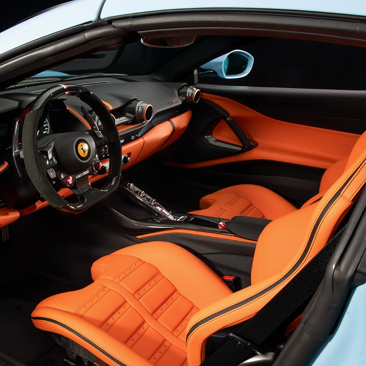La stiscia tricolore che attraversa in senso longitudinale l’intera carrozzeria è un richiamo al leggendario Tour de France. Anche la verniciatura scelta per vestire il corpo evoca le emozioni della sfida transalpina, intimamente legata alla tradizione della casa di Maranello. Basti citare la 250 TdF per avere un riscontro materico di questa liaison. Non meno seducente il trattamento dell’abitacolo, dominato, sul piano cromatico, dal contrasto tra gli elementi neri e i sedili in Pelle Frau in tinta mandarino.