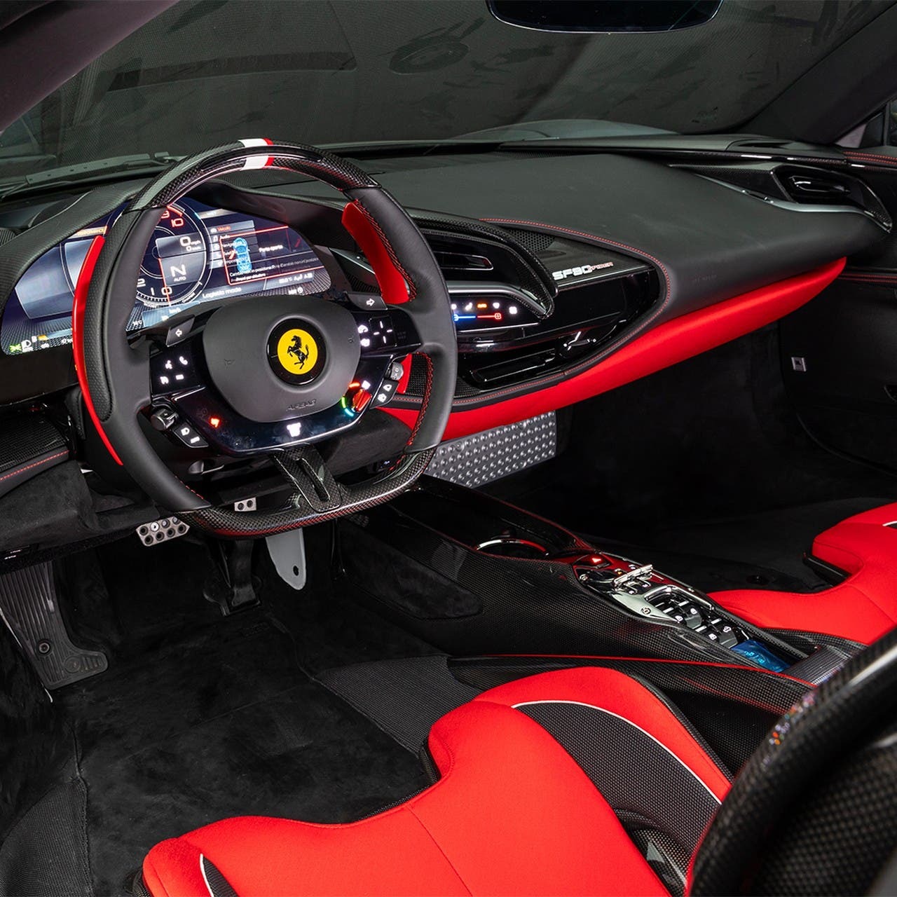 Al centro stile è stato commissionata una creazione dal marcato carattere, capace di mettere in ombra persino le sorelle. Verniciata in tinta Grigio Competizione, vanta delle strisce lucide asimmetriche Bianco King e Rosso Corsa. Favorita da una base già di eccezionale fattura, l’impronta conferita permette di distinguerla dal resto della famiglia, per la gioia dell’acquirente, desideroso di un bolide unico nel suo genere. Attraverso il profilo social ufficiale, l’esclusiva Ferrari SF90 Spider Assetto Fiorano viene mostrata in ogni singolo dettaglio, dagli esterni agli interni. È percepibile l’orgoglio provato dall’azienda per la creazione, facile da comprendere.