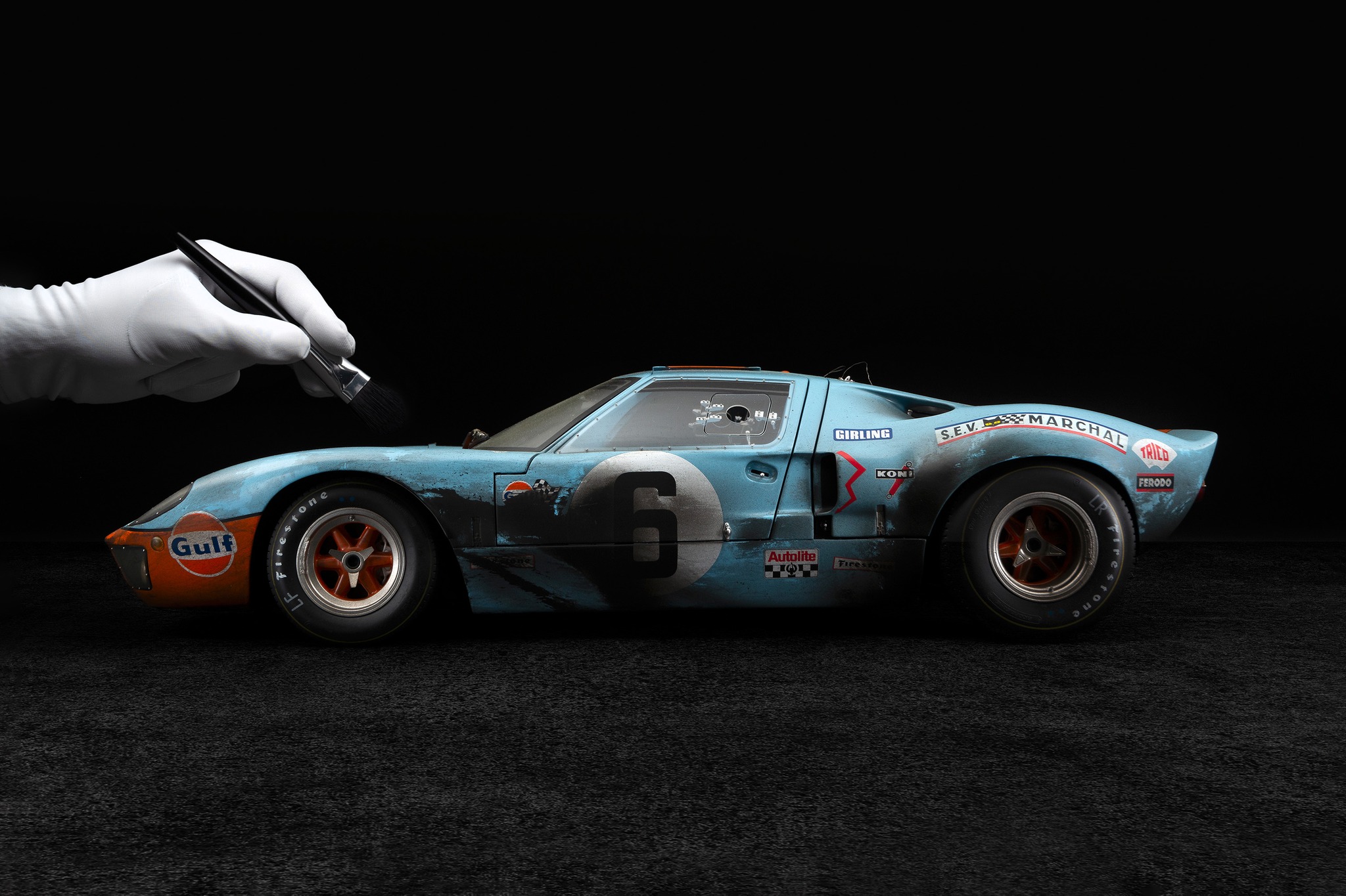 La replica in formato ridotto, come dicevamo, si basa sull’auto che giunse prima al traguardo della sfida della Sarthe con Jacky Ickx e Jackie Oliver, nel 1969. In pratica si tratta di quella con telaio numero 1075, entrata nella leggenda. Ogni esemplare in scala sarà costruito e assemblato a mano da un piccolo team di artigiani. Più di 4000 ore sono state necessarie per sviluppare il modello base. Oltre 450 ore servono per costruire ciascuna riproduzione della specie. Per ottenere l’eccellenza del risultato, gli uomini di Amalgam Collection si sono giovati dell’assistenza e della collaborazione del dipartimento Ford Archive and Heritage e di Gulf Oil International.