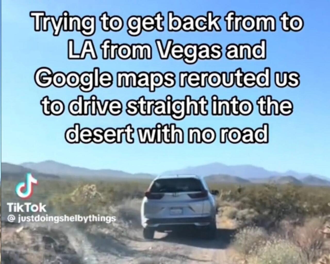 Una carovana di auto che tornava dalla Formula 1 a Las Vegas è stata mandata in mezzo al deserto da Google Maps, che cercava di evitare una bufera di sabbia. Il video della disavventura è stato condiviso su TikTok da Shelby Eisler. Il Washington Post ha intervistato la signora Eisler, che ha raccontato che lei e la sua famiglia, insieme a molte altre auto che seguivano la stessa deviazione, stavano obbedendo alle indicazioni di navigazione.