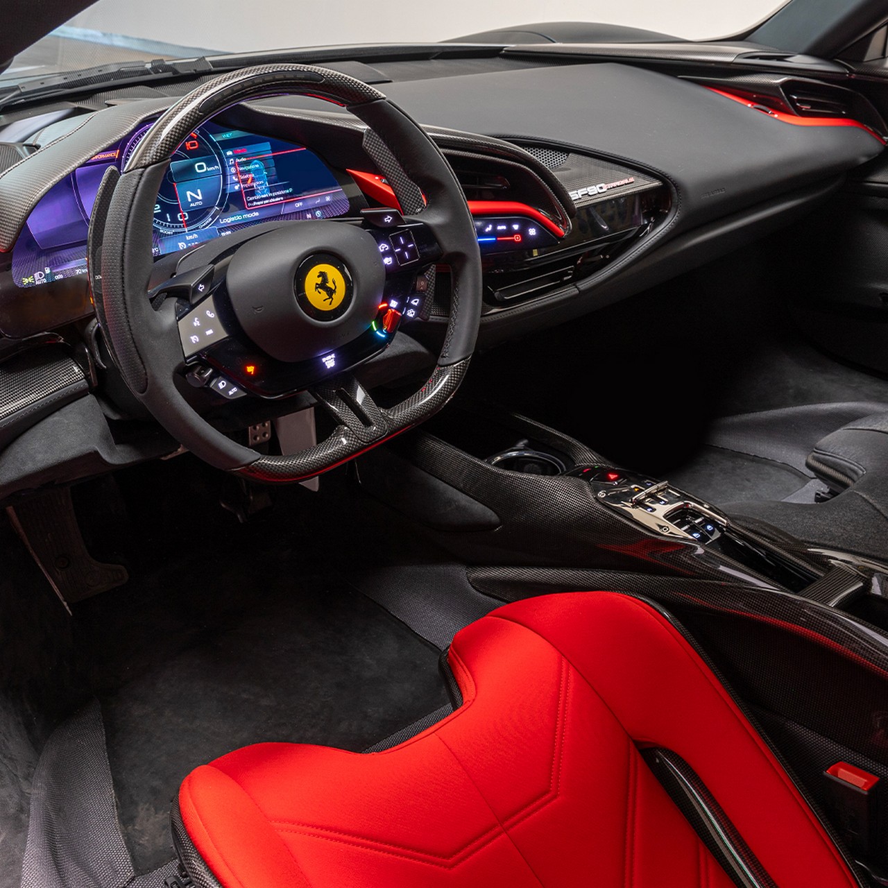 La Ferrari SF90 Stradale diventa un’arma perfetta per affrontare qualsiasi sfida stradale. L’abitacolo miscela lusso e tecnologia. I sedili avvolgenti sono un invito a prendere il controllo di questa belva italiana, mentre il quadro strumenti digitale mostra una vasta gamma di informazioni, comprese le modalità di guida e l’efficienza energetica. Questa vettura scrive un punto di incontro tra l’artigianato italiano e l’innovazione più avanzata.