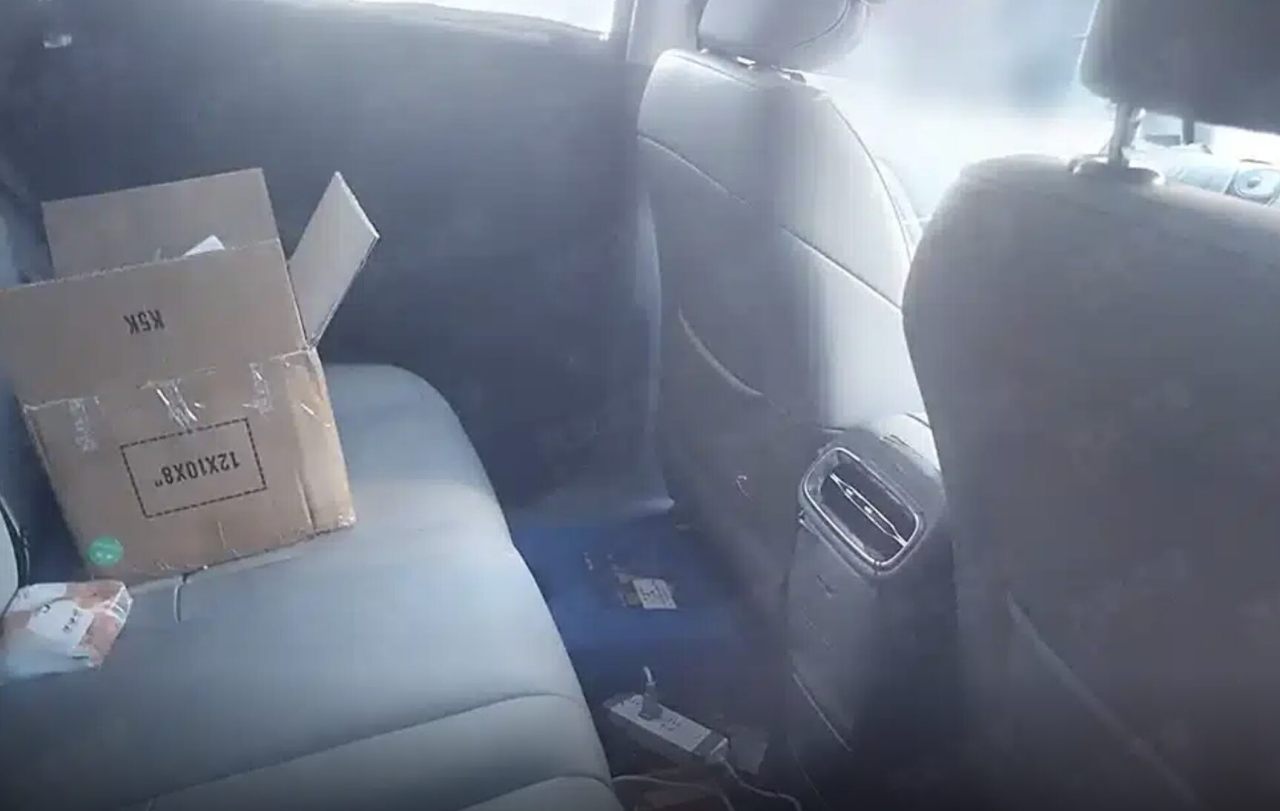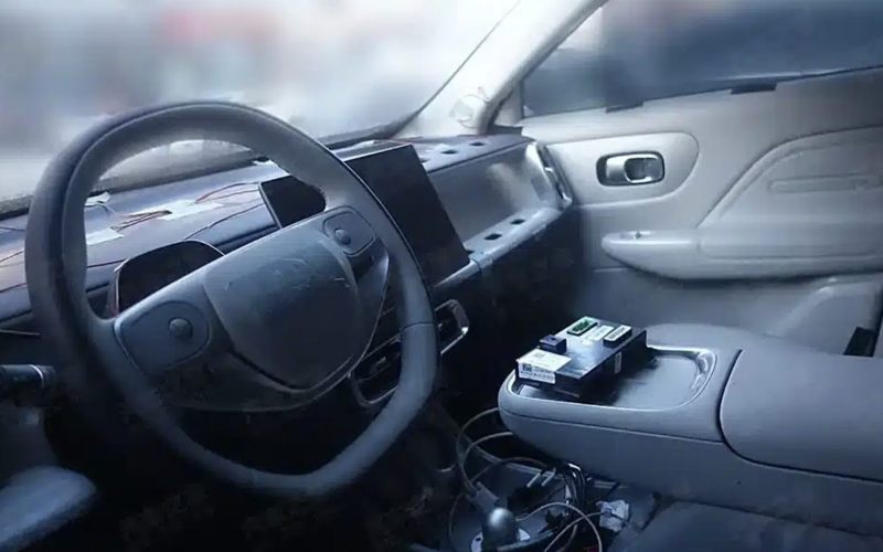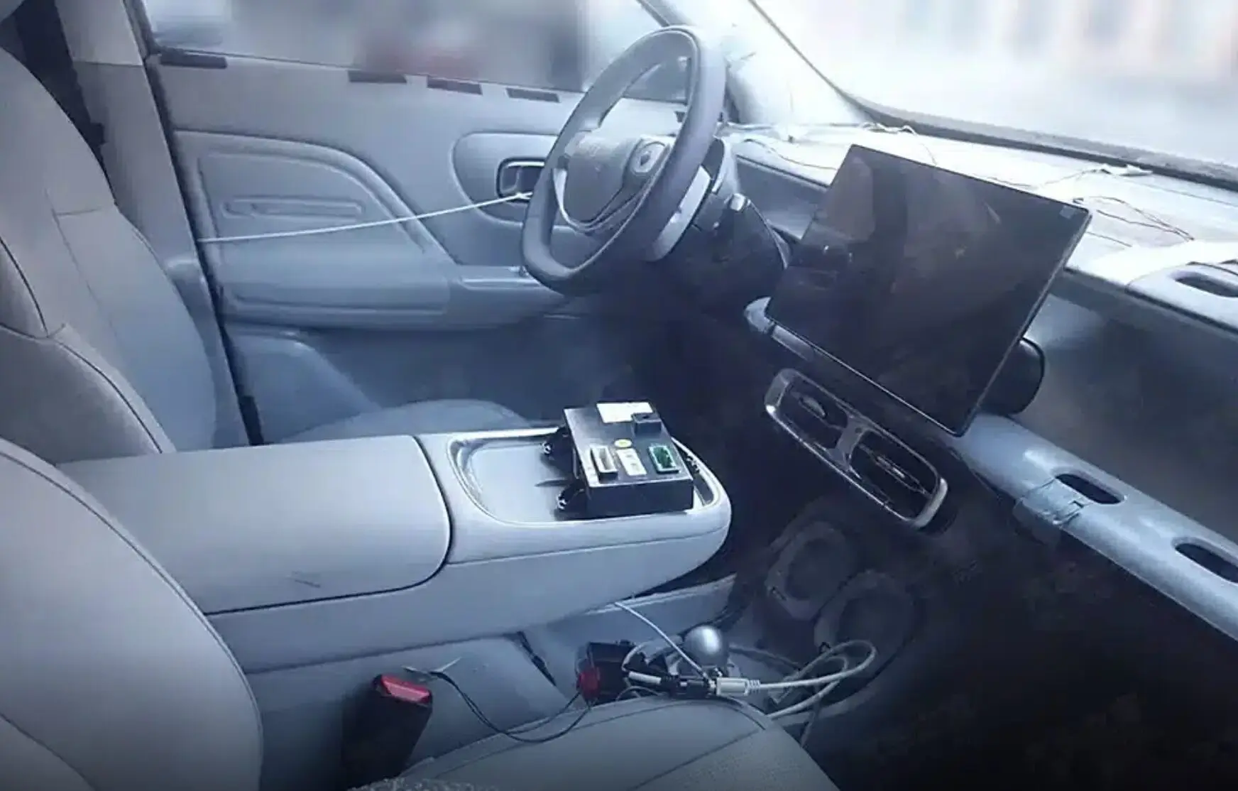 Dentro, spicca lo schermo di infotainment galleggiante montato al centro. Il volante a due razze a fondo piatto sembra avere solo due controlli a rotella. Montato sul piantone, un pannello strumenti molto piccolo. Due caricabatterie wireless per smartphone fluttuano sulla console, che non arriva fino al cruscotto. Sotto, un vassoio portaoggetti. Nel divano, si nota un oggetto sulla parte inferiore della console centrale: un mini frigorifero?