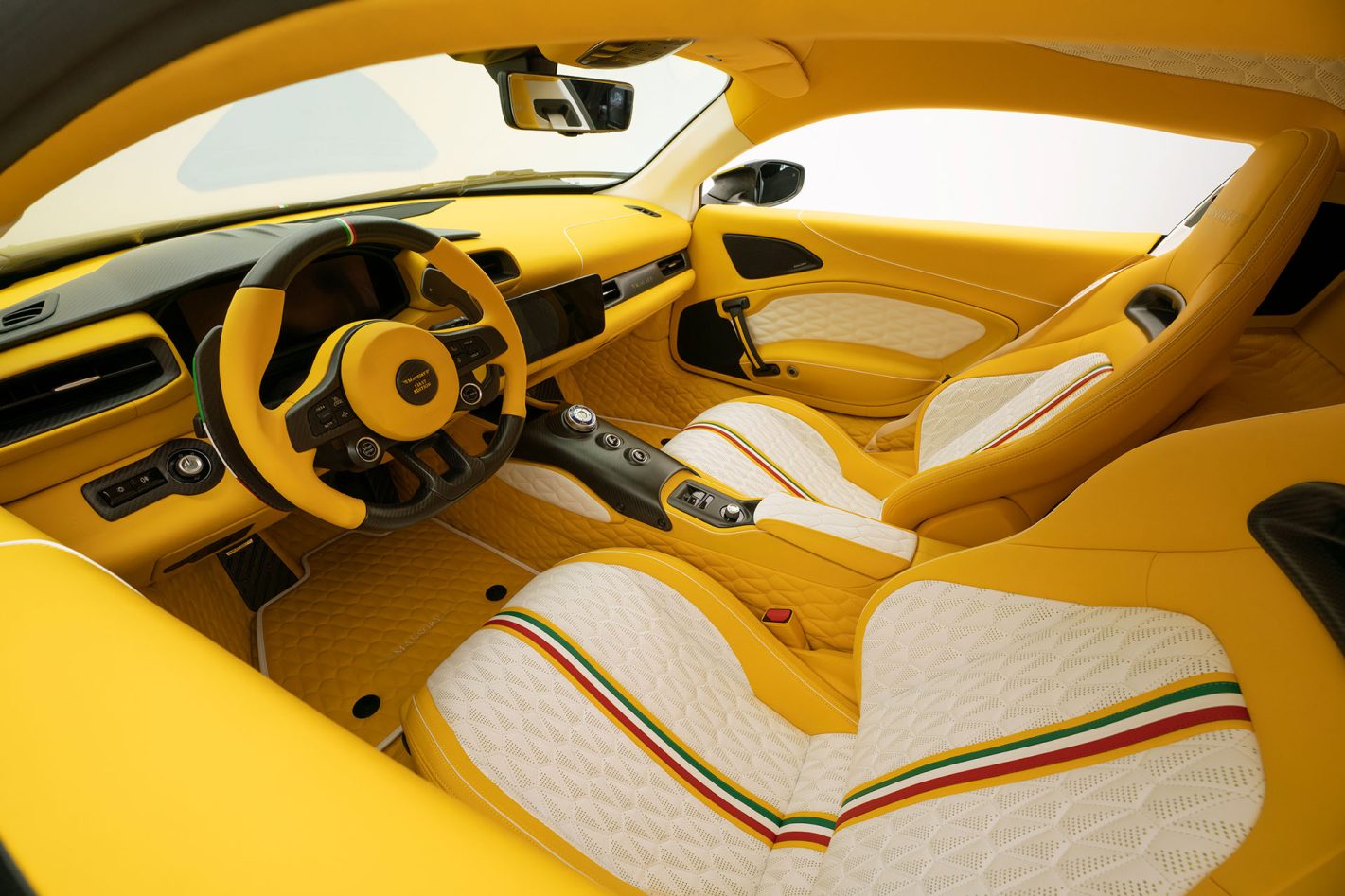 Gli interni restano liberamente selezionabili e configurabili dal cliente. Nel caso del veicolo qui mostrato, l’intero interno si mostra in tre tonalità di colore: giallo, bianco e nero. I colori nazionali dell’Italia si riflettono sotto forma di una striscia centrale sui sedili sportivi e sul cielo. Gli interni sono rivestiti interamente in pelle pregiata e morbida. Anche l’intero vano piedi e i relativi tappetini sono in pelle e in colore coordinato con il resto degli interni.