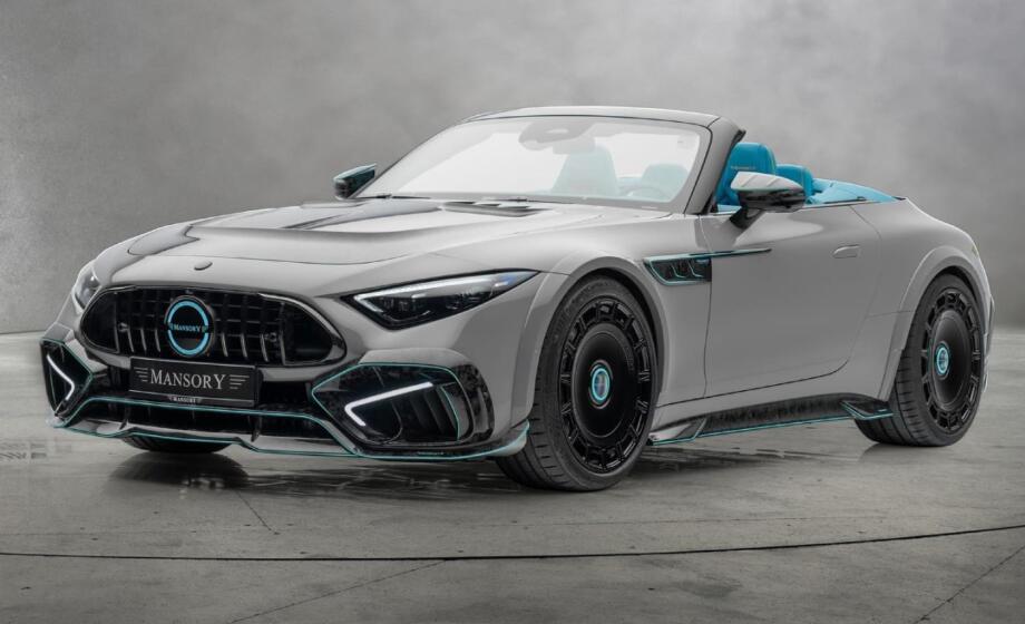 Sul fronte estetico, questa versione della Mercedes-AMG SL 63 si fa notare per il suo frontale caratteristico con una griglia rinnovata, un badge Mansory evidente, elementi in fibra di carbonio e inserti blu. Le luci diurne a LED a forma di L nelle prese d’aria aggiungono un elemento contemporaneo. Mansory ha anche installato minigonne laterali uniche e cerchi aftermarket.