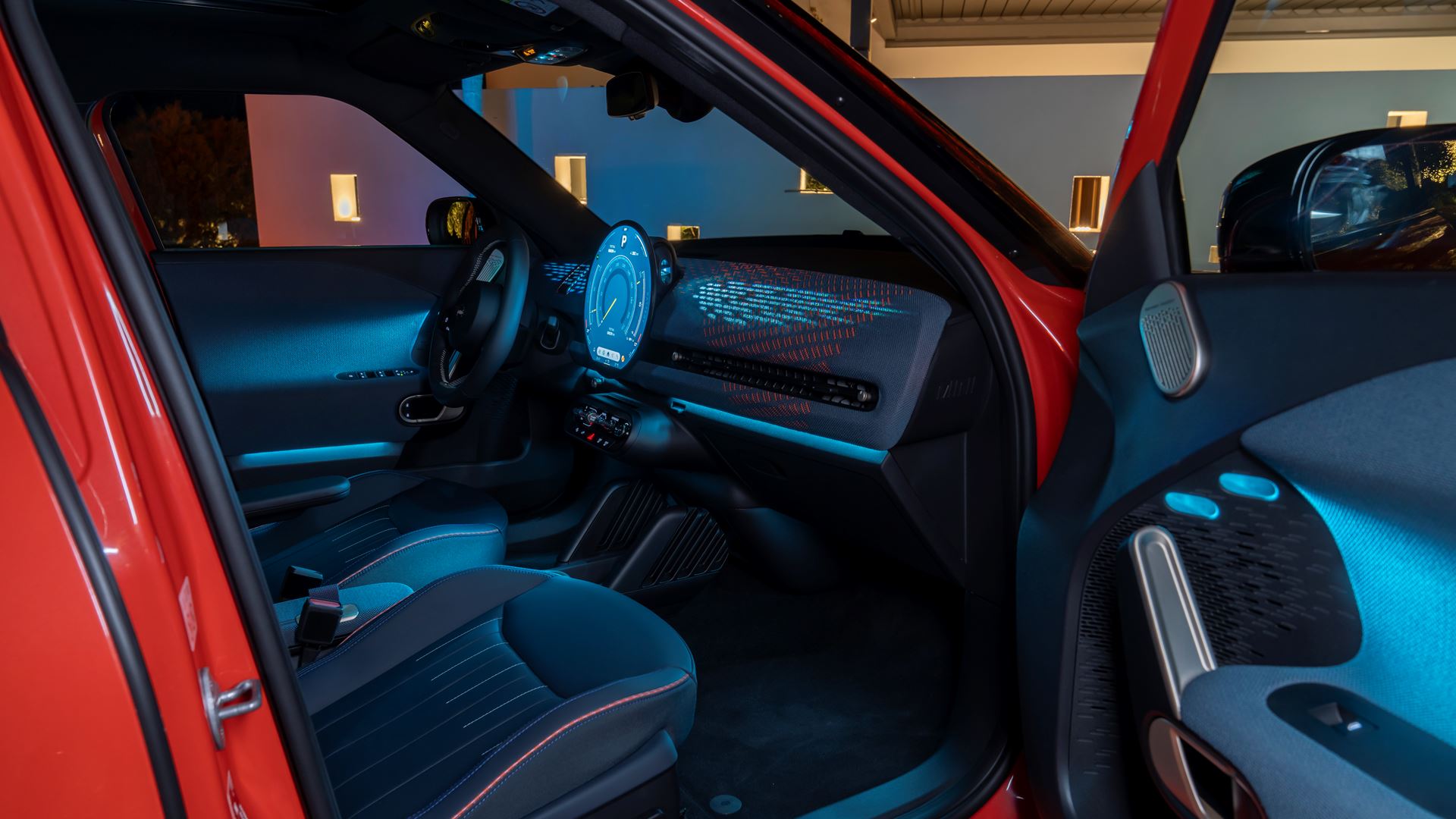 Gli interni, come da tradizione Mini, sono caratterizzati da un grande touchscreen che funge da centro di controllo per tutte le funzioni. Ormai è quasi scontato il design degli interni della Mini, arrivati a maturità nel corso degli anni e, soprattutto, a un’identità chiarissima e consolidata. I pulsanti fisici sono ridotti al minimo e facilmente raggiungibili. L’abitacolo comunica una personalità vivace, con motivi e materiali molto colorati.