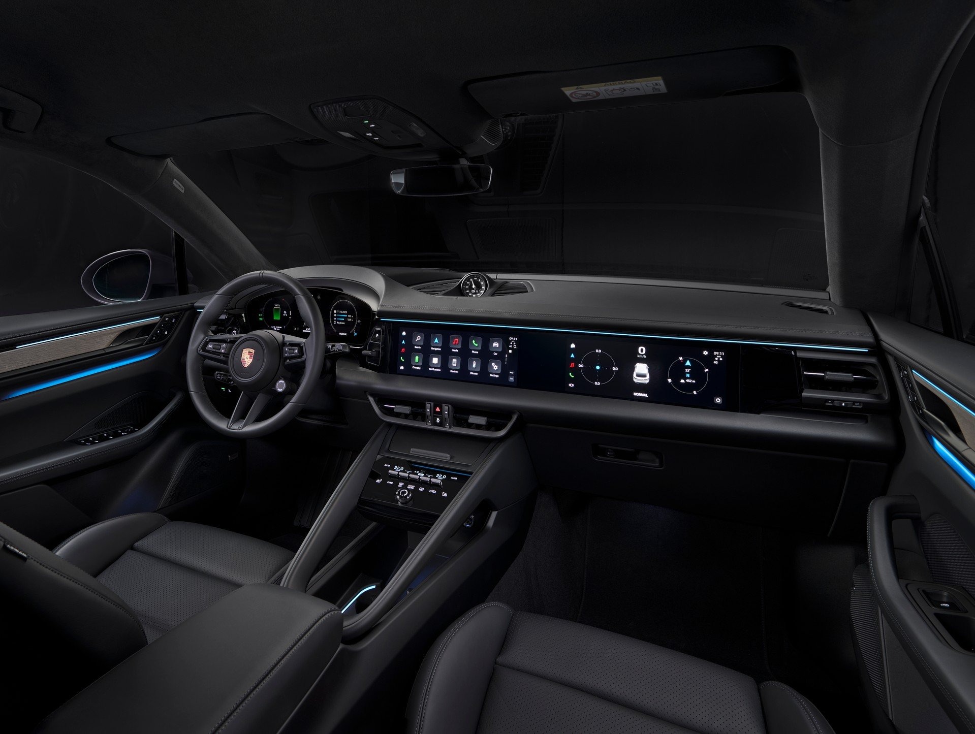 Per quanto riguarda gli interni, la Macan elettrica offre una plancia dotata di tre schermi, inclusa una strumentazione digitale da 12,6 pollici dietro al volante e un display centrale da 10,9 pollici per il sistema infotainment. È disponibile anche un display opzionale per il passeggero anteriore e un nuovo Head-Up Display. Il sistema infotainment utilizza Android Automotive OS e permette l’accesso a una varietà di app tramite il nuovo Porsche App Centre. Gli interni includono anche una fascia luminosa a LED integrata nel cruscotto e nelle portiere, funzionale sia come illuminazione diffusa sia come indicatore di avvisi. La vettura offre inoltre sedili leather free e materiali riciclati per gli interni.