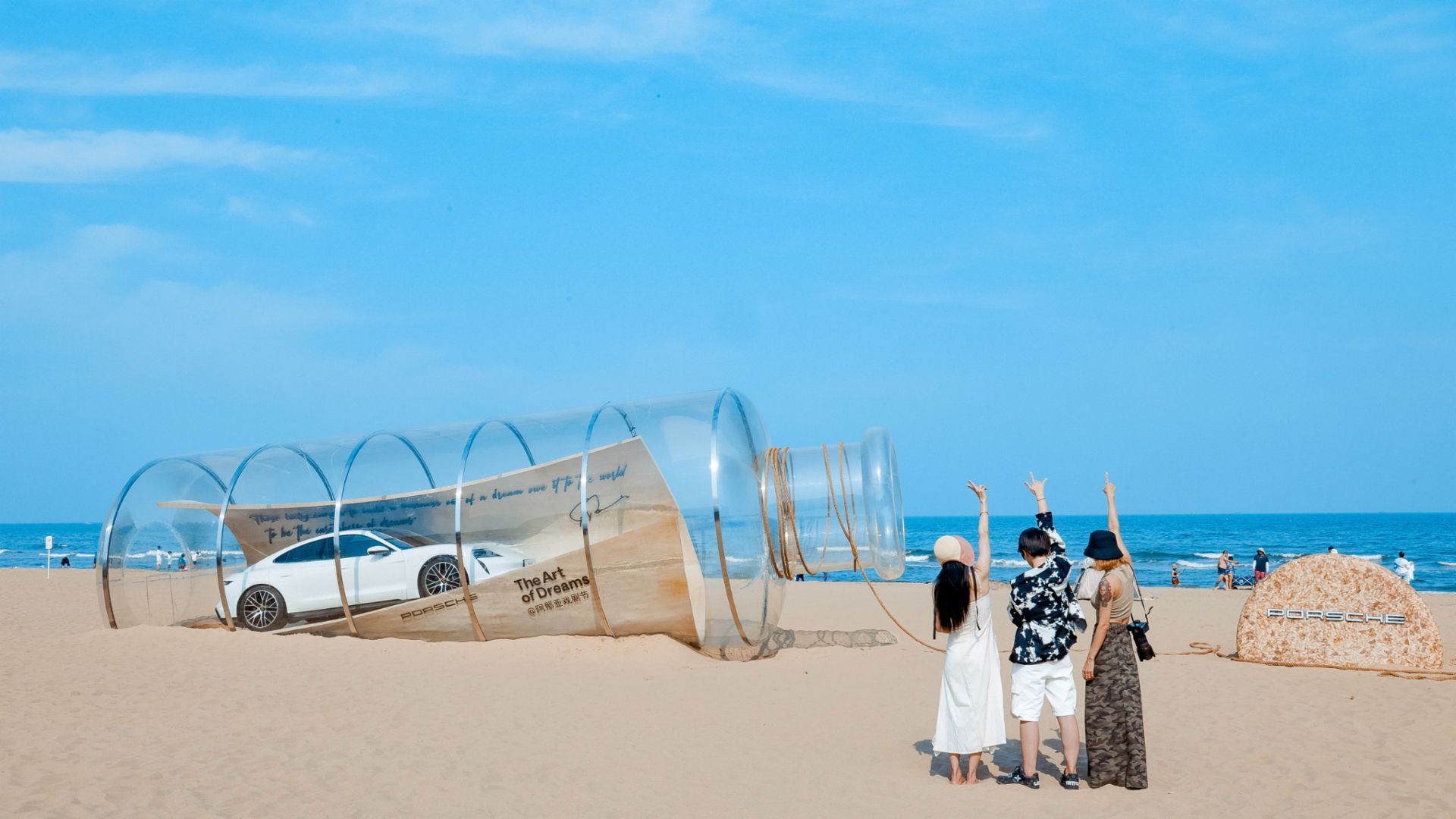 L’installazione congiunta “Dream On” e “Dream Capsule” celebra i 75 anni di auto Porsche con una pergamena del progetto della 356, racchiusa in una bottiglia alla deriva, che simboleggia il viaggio di trasformazione nella realizzazione dei propri sogni, dopo un “lavaggio” sulla costa di Aranya. La Taycan avvolta all’interno della pergamena illustra come la casa automobilistica tedesca interpreti la visione di Ferry Porsche nel mondo moderno.