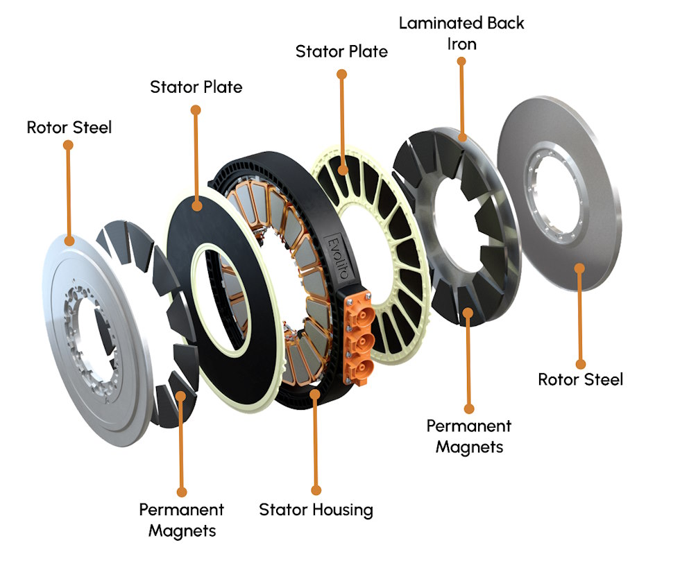 Una delle peculiarità di questi motori è la loro forma compatta e piatta, con un diametro ampio e uno spessore ridotto, motivo per cui sono spesso definiti “motori a disco”. Questa particolare architettura consente di generare più coppia, poiché il rotore è collocato lateralmente allo statore invece che al suo interno, come avviene nei motori tradizionali. Questa configurazione permette di ottenere campi magnetici più intensi e quindi una maggiore efficienza.