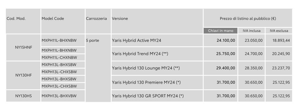 I prezzi per la nuova Toyota Yaris Hybrid 2024 partono da 24.100 euro per la versione Hybrid 115 Active e arrivano fino a 31.700 euro per la Hybrid 130 nelle versioni GR SPORT e Premiere Edition.