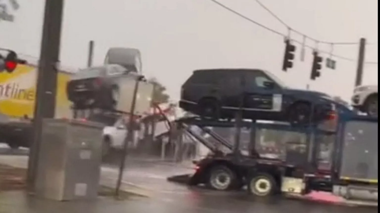 Le immagini proposte dal video, pubblicato su YouTube da alcune TV e girato dall’utente Alexander Quintero, mostrano una bisarca piena di costosi veicoli, che fatica a procedere oltre, quando il rimorchio è a cavallo della linea ferrata. Non si capisce perché non riesca ad avanzare. Forse per un guasto tecnico.