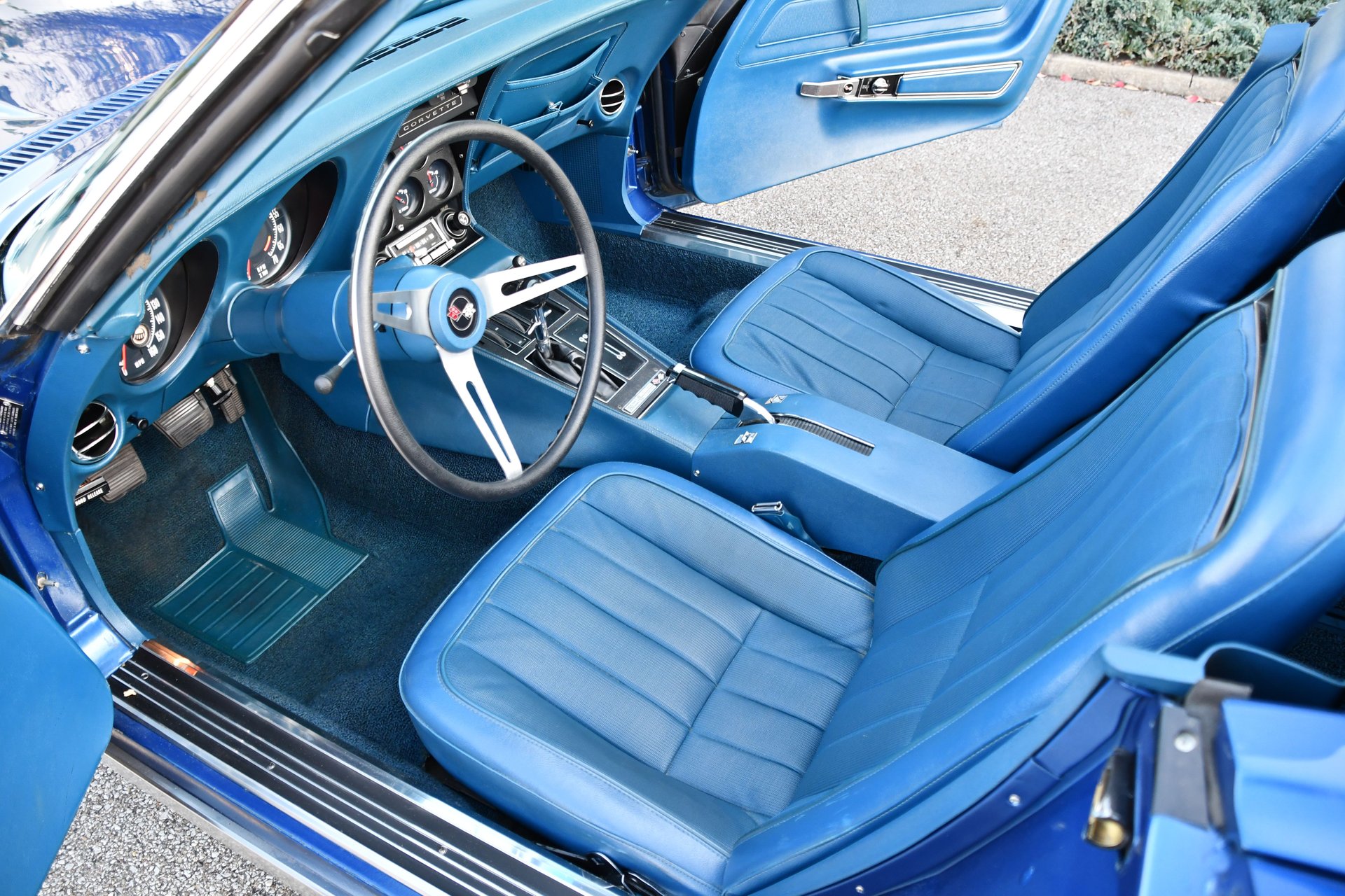 Una delle caratteristiche che emerge subito allo sguardo è la verniciatura Targa Blue della carrozzeria. Non mi sembra un cromatismo molto ricorrente sul modello, ma potrei sbagliarmi. Sotto il cofano anteriore pulsa un’unità propulsiva V8 small-block “350”, con alesaggio e corsa di 101.6 e 88.4 mm, per una cilindrata totale di 5733 centimetri cubi. L’energia che sviluppa viene scaricata al suolo col supporto di un cambio manuale a 4 velocità, di intonazione confortevole, quindi non del tutto allineato allo spirito del modello. Molto gradevole l’allestimento dell’abitacolo, dominato dalla tinta blu, in pendat con il colore scelto per vestire gli esterni, così configurati in occasione di una riverniciatura.