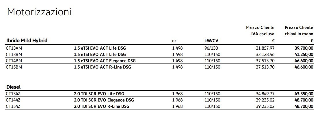 La configurazione R-Line, invece, si distingue per i cerchi in lega da 19 pollici, lo spoiler sul tetto e i pannelli laterali dal design sportivo R-Line. Gli interni sfoggiano sedili sportivi specifici e una pedaliera in acciaio spazzolato.